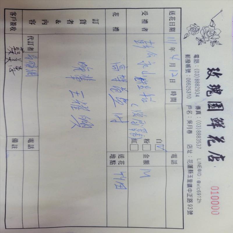 首頁 贈禮1(花籃/水果籃) 藝術高架花籃B款 藝術高架花籃B款 NT$ 3,100 贈禮1(花籃/水果籃) 供應商:玫瑰園花藝設計茶坊 銷售地區(詳細範圍): 花蓮縣 此商品已售出次數:1 商品流水號:2021060229 商品類別:贈禮1(花籃/水果籃) > 喪事 > 花籃 購物操作說明: 分享: 分享此網頁至 臉書 數量 (單位:對 ) 1 小計 NT$0 加入購物車 進行結帳 回上一頁 回上一頁 客服諮詢(加Line好友): 商品說明 商品說明 商品類別:佈置 主要材質 ✿香水百合、非洲菊、季節性花材、配花、葉材等搭配等 顏色說明 ✿以當季花材為主✿依等值花材,色系不變下作調整 尺寸 長:實際尺寸依植物生長形態有所不同 高:約160-170CM 配件說明 ※適用於喪禮弔唁、追思致意。※花材常有季節性短缺的問題,若該花材短缺圖片中花材會稍加更動將以同等花材代替。✿花泥、花盆、緞帶、布幔、鐵架✿花盆、緞帶、布幔等圖片內之顏色和材料因市場因素、時節不同而有所調整,以收到實品為主 佈置程序 ★請於使用前3日訂購★依據客戶所設定的送貨時間或訃聞告別式時間提早送至會場★請於備註填寫逝者相關資料及落款1.亡者年齡2.贈送人★訂購花禮,皆有免費提供花卡,請於結帳前填寫清楚★客服人員收到訂單會主動與您連繫確認送貨資訊及花卡內容★送達後會請收花人簽收後並拍照上傳★客戶可於送達日隔日登入查詢到貨照片並給予評價★如有疑問或緊急訂單可洽詢線上客服或撥打客服專線 全部評價 客戶評價 (1) 廠商總評 ( 0 ) 客戶評價 [商品到貨] 送貨地址:花蓮縣富里鄉 送貨時間: 2022-04-13 商品到貨照片: 總筆數:1 供應商評價 很好 好 普通 不好 很不好 0 0 0 0 0 相似商品 典雅高架花籃(B04款) NT$7,300 高架花籃(A07款) NT$6,150 高架花籃D款 NT$6,000 高雅藝術花籃A款 NT$5,700 巨型藝術高架花籃 NT$4,900 追思高架花藍A9 NT$3,680 追思高架花籃A02 NT$3,450 追思高架花藍 NT$2,800 追思高架花籃A01 NT$2,760 花籃 蘭花 水果籃 罐頭塔 靈獅 蓮花塔 商品成功加入購物車 !