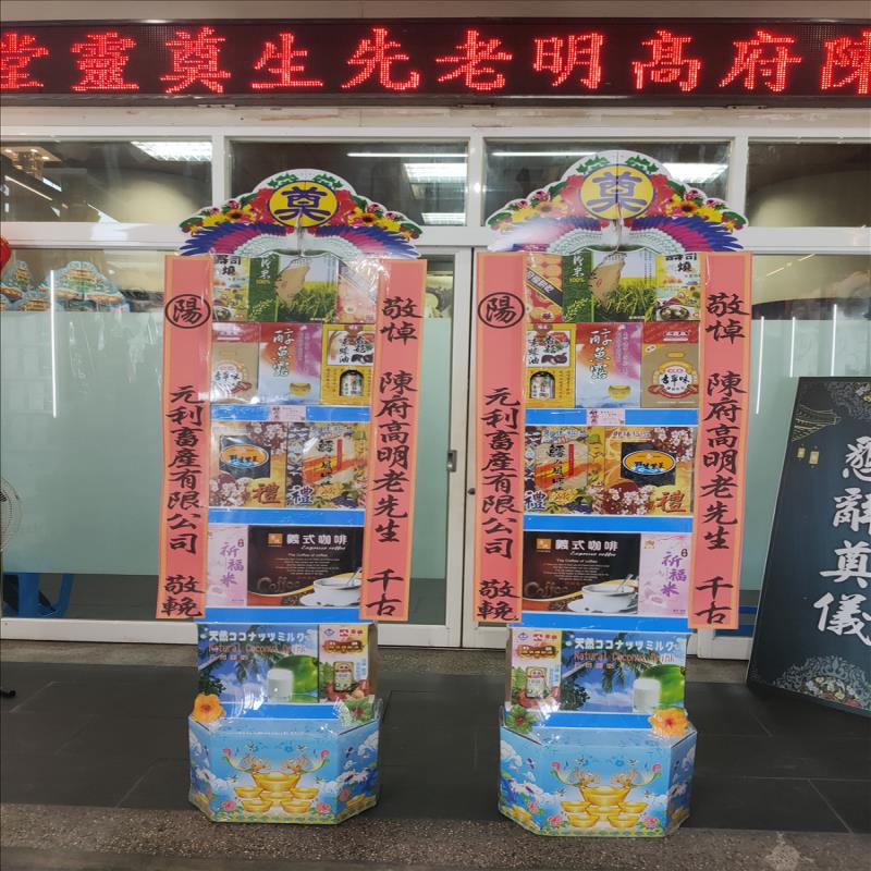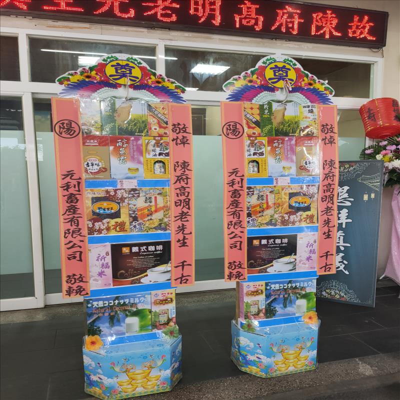 首頁 贈禮3(塔,柱,靈獅...) 罐頭塔7尺3 罐頭塔7尺3 NT$ 4,280 贈禮3(塔,柱,靈獅...) 供應商:竹心崗有限公司 銷售地區(詳細範圍): 嘉義市, 臺南市, 高雄市, 屏東縣 此商品已售出次數:1 商品流水號:2021070349 商品類別:贈禮3(塔,柱,靈獅...) > 喪事平面罐頭塔 購物操作說明: 分享: 分享此網頁至 臉書 數量 (單位:對 ) 1 小計 NT$0 加入購物車 進行結帳 回上一頁 回上一頁 客服諮詢(加Line好友): 商品說明 商品說明 商品類別:佈置 主要材質 瓦楞紙底座 顏色說明 (名條上下款)淺藍色:60歲以下 粉色:60~80歲 紅色:80歲以上➡️產品的品牌、包裝等內容物會依現有商品出貨調整不在另行通知、罐頭塔或禮籃的造型及外包裝有時也會不定時更改外觀型狀,但內容物價值不變,客戶於下單前若無法接受,請勿下單!!!➡️若有不清楚建議下單前可以與客服人員聯繫。➡️因內容物為食品類商品,且訂單為客戶確認後下單才會開始客製製作,商品需另組裝完成,送貨到達現場即代表送貨完成,不適用七天鑑賞期無法進行退換貨,若能接受再下單。➡️專業配送,保證產品完整性,商品送達後會拍照回傳,若人員離開後有任何損壞不屬於公司責任。====訂購前請先確認好相關規定,無法接受時請勿下訂單==== 尺寸 長:50CM 寬:40CM 高:219CM 配件說明 寶特瓶飲料.野生海苔.盒裝燕窩.野生紫菜.鱈魚燒盒.泰山蔬菜油.蜂蜜.巧思派玉米濃湯.壽司燒奇福餅.果凍.義式咖啡.鮮魚露.金蘭油膏.蔭油 佈置程序 罐頭塔是初聞親友發生喪事,為表示對亡者的哀悼,遂具祭品祭拜。但祭品容易敗壞,因此用罐頭食品或飲料祭拜,一方面可以在靈前久放,一方面也可以給遺眷日後食用。 全部評價 客戶評價 (1) 廠商總評 ( 3 ) 客戶評價 [商品到貨] 送貨地址:屏東縣屏東市 送貨時間: 2022-05-26 商品到貨照片: 總筆數:1 供應商評價 5 很好 好 普通 不好 很不好 3 0 0 0 0 相似商品 B06 五層平安米油塔 NT$7,200 九層平面飲料塔 NT$4,150 綜合食品飲料禮籃 NT$3,600 綜合飲料禮籃 NT$3,600 5層平面罐頭塔 NT$3,375 綜合罐頭塔A款 NT$3,000 桌上型綜合平安米禮籃 NT$3,000 {貨運配送}平面七層罐頭塔-710款... NT$3,000 7-1 7層平面罐頭塔 NT$1,650 花籃 蘭花 水果籃 罐頭塔 靈獅 蓮花塔 商品成功加入購物車 !
