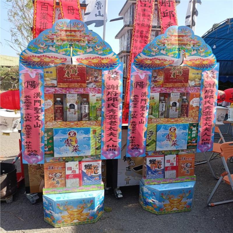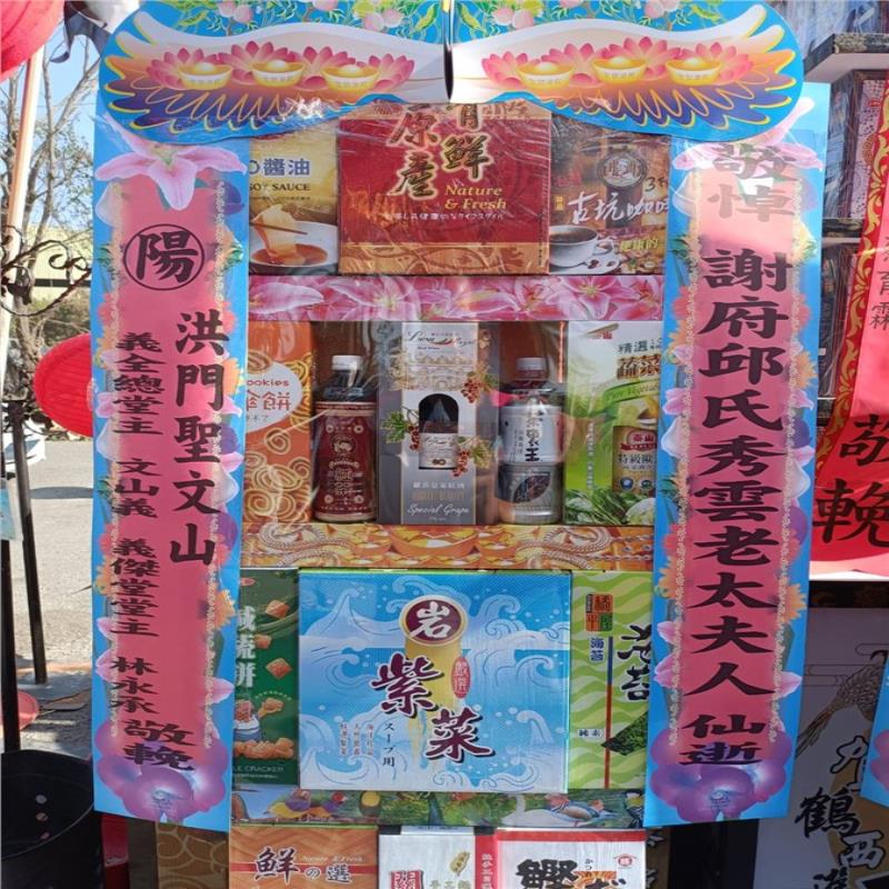 首頁 贈禮3(塔,柱,靈獅...) 綜合罐頭塔A款 綜合罐頭塔A款 NT$ 2,970 贈禮3(塔,柱,靈獅...) 供應商:金美芳花苑 銷售地區(詳細範圍): 臺南市 此商品已售出次數:1 商品流水號:2021070919 商品類別:贈禮3(塔,柱,靈獅...) > 喪事平面罐頭塔 購物操作說明: 分享: 分享此網頁至 臉書 數量 (單位:對 ) 1 小計 NT$0 加入購物車 進行結帳 回上一頁 回上一頁 客服諮詢(加Line好友): 商品說明 商品說明 商品類別:百貨類 產地 台灣 材質 飲料、餅乾、罐頭...等等民生用品 使用說明 ◆適用於喪禮告別式悼念敬輓用。 ◆本產品以「對」為單位。 ◆採用之食品均為台灣製優良知名品牌,品質保證嚴格控管,絕無過期產品。 ◆擁有最完善的專業配送,保證產品完整性。 ◆送達後會請收件人簽收後並拍照上傳。 產品特色 ◆有一說是喪事期間親友有錢出錢、有力出力,其中有些人便會提供食物作為祭品,待出殯以後再由喪家分送給親友,而罐頭塔就是在食物種類越來越多樣的時候所出現的祭品選項之一。 ◆還有一種說法是早期的罐頭以柴米油鹽醬醋茶為主,是由親家所送的。因為治喪期間喪家處理後事十分地忙碌,親家送這些東西表示幫他們在這段時間裡「顧厝」。至於拿罐頭來裝柴米油鹽醬醋茶的原因,大概是因為方便準備、攜帶與保存。 全部評價 客戶評價 (1) 廠商總評 ( 1 ) 客戶評價 [商品到貨] 送貨地址:臺南市佳里區 送貨時間: 2023-01-27 商品到貨照片: 總筆數:1 供應商評價 5 很好 好 普通 不好 很不好 1 0 0 0 0 相似商品 5層平安米塔(平安米30台斤) NT$9,000 9層平面綜合飲料罐頭塔-桃園 NT$5,250 祈福平安米塔 NT$4,000 綜合罐頭塔A款 NT$3,000 {貨運配送}平面七層罐頭塔-707款... NT$2,850 銀耳露禮籃(A01) (限殯儀館內) NT$2,700 追思禮籃B2 NT$2,650 7-7 7層平面罐頭塔 NT$2,500 平面七層罐頭塔-702款 NT$1,300 花籃 蘭花 水果籃 罐頭塔 靈獅 蓮花塔 商品成功加入購物車 !