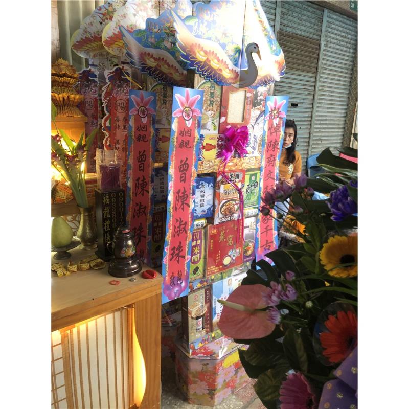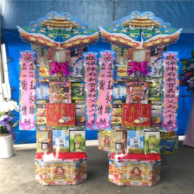 首頁 贈禮3(塔,柱,靈獅...) 五層食品罐頭禮籃(屏東) 五層食品罐頭禮籃(屏東) NT$ 3,000 贈禮3(塔,柱,靈獅...) 供應商:正佳禮籃 銷售地區(詳細範圍): 屏東縣 此商品已售出次數:2 商品流水號:2021071003 商品類別:贈禮3(塔,柱,靈獅...) > 喪事平面罐頭塔 購物操作說明: 分享: 分享此網頁至 臉書 數量 (單位:對 ) 1 小計 NT$0 加入購物車 進行結帳 回上一頁 回上一頁 客服諮詢(加Line好友): 商品說明 商品說明 商品類別:百貨類 產地 台灣 材質 食用油.米.醬油.麵.烏醋 尺寸 高:約160CM 使用說明 ◆適用於喪禮告別式悼念敬輓用。◆本產品以「對」為單位。◆採用之食品均為台灣製優良知名品牌,品質保證嚴格控管,絕無過期產品。◆擁有最完善的專業配送,保證產品完整性。◆送達後會請收件人簽收後並拍照上傳。 產品特色 ◆有一說是喪事期間親友有錢出錢、有力出力,其中有些人便會提供食物作為祭品,待出殯以後再由喪家分送給親友,而罐頭塔就是在食物種類越來越多樣的時候所出現的祭品選項之一。◆還有一種說法是早期的罐頭以柴米油鹽醬醋茶為主,是由親家所送的。因為治喪期間喪家處理後事十分地忙碌,親家送這些東西表示幫他們在這段時間裡「顧厝」。至於拿罐頭來裝柴米油鹽醬醋茶的原因,大概是因為方便準備、攜帶與保存。 全部評價 客戶評價 (2) 廠商總評 ( 2 ) 客戶評價 [商品到貨] 送貨地址:屏東縣鹽埔鄉 送貨時間: 2023-11-01 商品到貨照片: [商品到貨] 送貨地址:屏東縣九如鄉 送貨時間: 2023-02-27 商品到貨照片: 總筆數:2 供應商評價 5 很好 好 普通 不好 很不好 2 0 0 0 0 相似商品 B05 四層平安米塔 NT$6,000 8尺5全中興米5層罐頭塔 NT$6,000 4X4祈福平安米罐頭塔 NT$5,400 9層平安米 NT$4,800 7層綜合罐頭塔 NT$4,350 七層飲料食品罐頭塔 NT$3,000 小保麗龍飲料塔 NT$3,000 7-8 7層平面罐頭塔 NT$2,950 七層平面飲料食品罐頭塔 NT$2,400 花籃 蘭花 水果籃 罐頭塔 靈獅 蓮花塔 商品成功加入購物車 !