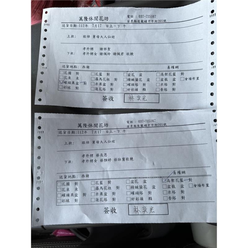 首頁 贈禮1(花籃/水果籃) A03_藝術高架花籃 A03_藝術高架花籃 NT$ 3,450 贈禮1(花籃/水果籃) 供應商:萬隆休閒花坊 銷售地區(詳細範圍): 苗栗縣 此商品已售出次數:2 商品流水號:2021072088 商品類別:贈禮1(花籃/水果籃) > 喪事 > 花籃 購物操作說明: 分享: 分享此網頁至 臉書 數量 (單位:對 ) 1 小計 NT$0 加入購物車 進行結帳 回上一頁 回上一頁 客服諮詢(加Line好友): 商品說明 商品說明 商品類別:佈置 主要材質 ✿花材:菊花、百合、時令花材為主 顏色說明 ✿以當季花材為主✿依等值花材,色系不變下作調整 尺寸 長:每盆依其生長的不同有不同高度 配件說明 ※花材常有季節性短缺的問題,若該花材短缺圖片中花材會稍加更動將以同等花材代替。✿花泥、花盆、緞帶、布幔、鐵架✿花盆、緞帶、布幔等圖片內之顏色和材料因市場因素,時節不同而有所調整,以收到實品為主 佈置程序 ★請於使用前3日訂購★依據客戶所設定的送貨時間提早送至會場★訂購花禮,皆有免費提供花卡,請於結帳前填寫清楚★客服人員收到訂單會主動與您連繫確認送貨資訊及花卡內容★送達後會請收花人簽收後並拍照上傳★客戶可於送達日隔日登入查詢到貨照片並給予評價★如有疑問或緊急訂單可洽詢線上客服或撥打客服專線✿花材會隨季節而有所不同,如遇市場短缺或品質不良,得以等值花材替代,圖片中只提供參考,會依主花不變的狀況下,依等值,色系、尺寸不變下作調整,敬請見諒!✿鮮花屬於生鮮產品,因有保鮮期限,不適用於商品使用七天鑑賞期,商品送達一律不接受退貨。✿會隨季節而有所不同,如遇市場短缺或品質不良,得以等值材料替代,圖片中只提供參考,會依等值,色系、尺寸不變下作調整,敬請見諒!✿屬於生鮮產品,因有保鮮期限,不適用於商品使用七天鑑賞期,商品送達一律不接受退貨。 全部評價 客戶評價 (2) 廠商總評 ( 2 ) 客戶評價 [商品到貨] 送貨地址:苗栗縣西湖鄉 送貨時間: 2023-07-17 商品到貨照片: [商品到貨] 送貨地址:苗栗縣後龍鎮 送貨時間: 2022-05-01 商品到貨照片: 無 總筆數:2 供應商評價 5 很好 好 普通 不好 很不好 2 0 0 0 0 相似商品 典雅高架花籃(A10款) NT$7,700 典雅高架花籃(A05款) NT$7,360 典雅花柱 NT$5,500 藝術高架花藍E款 NT$3,100 典雅高架花籃(A03款) NT$2,760 不指定款式高架花籃(B02款)(限殯... NT$2,760 高架花籃20 NT$2,600 高雅高架花籃(A02款) NT$2,500 典雅高架花籃B01 (限殯儀館內) NT$2,300 花籃 蘭花 水果籃 罐頭塔 靈獅 蓮花塔 商品成功加入購物車 !
