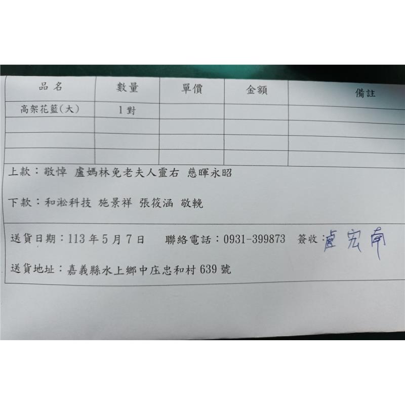 首頁 贈禮1(花籃/水果籃) 追思藝術花籃A款 追思藝術花籃A款 NT$ 4,300 贈禮1(花籃/水果籃) 供應商:嘉民花藝設計工作坊 銷售地區(詳細範圍): 嘉義市, 嘉義縣 此商品已售出次數:1 商品流水號:2021080430 商品類別:贈禮1(花籃/水果籃) > 喪事 > 花籃 購物操作說明: 分享: 分享此網頁至 臉書 數量 (單位:對 ) 1 小計 NT$0 加入購物車 進行結帳 回上一頁 回上一頁 客服諮詢(加Line好友): 商品說明 商品說明 商品類別:佈置 主要材質 ✿花材:菊花、百合、當季花材為主 顏色說明 ✿盆花花色皆可討論✿以當季花材為主 尺寸 長:實際尺寸依植物生長形態有所不同 配件說明 ※適用於喪禮弔唁、追思致意。※花材常有季節性短缺的問題,若該花材短缺圖片中花材會稍加更動將以同等花材代替。 佈置程序 ★請於使用前3日訂購★依據客戶所設定的送貨時間或訃聞告別式時間提早送至會場★請於備註填寫逝者相關資料及落款1.亡者年齡2.贈送人★訂購花禮,皆有免費提供花卡,請於結帳前填寫清楚★客服人員收到訂單會主動與您連繫確認送貨資訊及花卡內容★送達後會請收花人簽收後並拍照上傳★客戶可於送達日隔日登入查詢到貨照片並給予評價★如有疑問或緊急訂單可洽詢線上客服或撥打客服專線✿花材會隨季節而有所不同,如遇市場短缺或品質不良,得以等值花材替代,圖片中只提供參考,會依主花不變的狀況下,依等值,色系、尺寸不變下作調整,敬請見諒!✿鮮花屬於生鮮產品,因有保鮮期限,不適用於商品使用七天鑑賞期,商品送達一律不接受退貨 全部評價 客戶評價 (1) 廠商總評 ( 0 ) 客戶評價 [商品到貨] 送貨地址:嘉義縣水上鄉 送貨時間: 2024-05-07 商品到貨照片: 總筆數:1 供應商評價 很好 好 普通 不好 很不好 0 0 0 0 0 相似商品 弔唁高架花籃(B05款) NT$7,400 典雅風範高架花藍B款 NT$6,924 追思花籃C款 NT$4,600 圓型高架花籃(A04款) NT$3,850 高架花籃 NT$3,850 A13 高架花籃 NT$3,000 悼念高架花籃A01 NT$2,760 追思弔唁花藍 NT$2,600 典雅高架花籃B01 (限殯儀館內) NT$2,300 花籃 蘭花 水果籃 罐頭塔 靈獅 蓮花塔 商品成功加入購物車 !